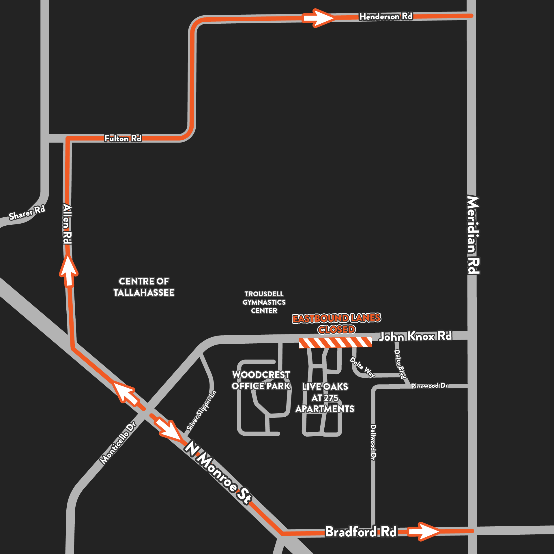 To safely facilitate the next portion of construction, eastbound John Knox Road between Delta Way and Woodcrest Office Park will be closed from Monday, Feb. 13, through Monday, March 27, weather permitting. Local access will be maintained, and detour routes will be clearly posted using signs and variable message boards. Detours will direct thru traffic to use Monroe Street to Allen Road to Fulton Road / Grady Road / Henderson Road to N. Meridian Road. The second route will direct thru traffic to use Monroe Street to Bradford Road to N. Meridian Road. Work hours for this closure will be Monday through Saturday from 7 a.m. to 7:30 p.m.